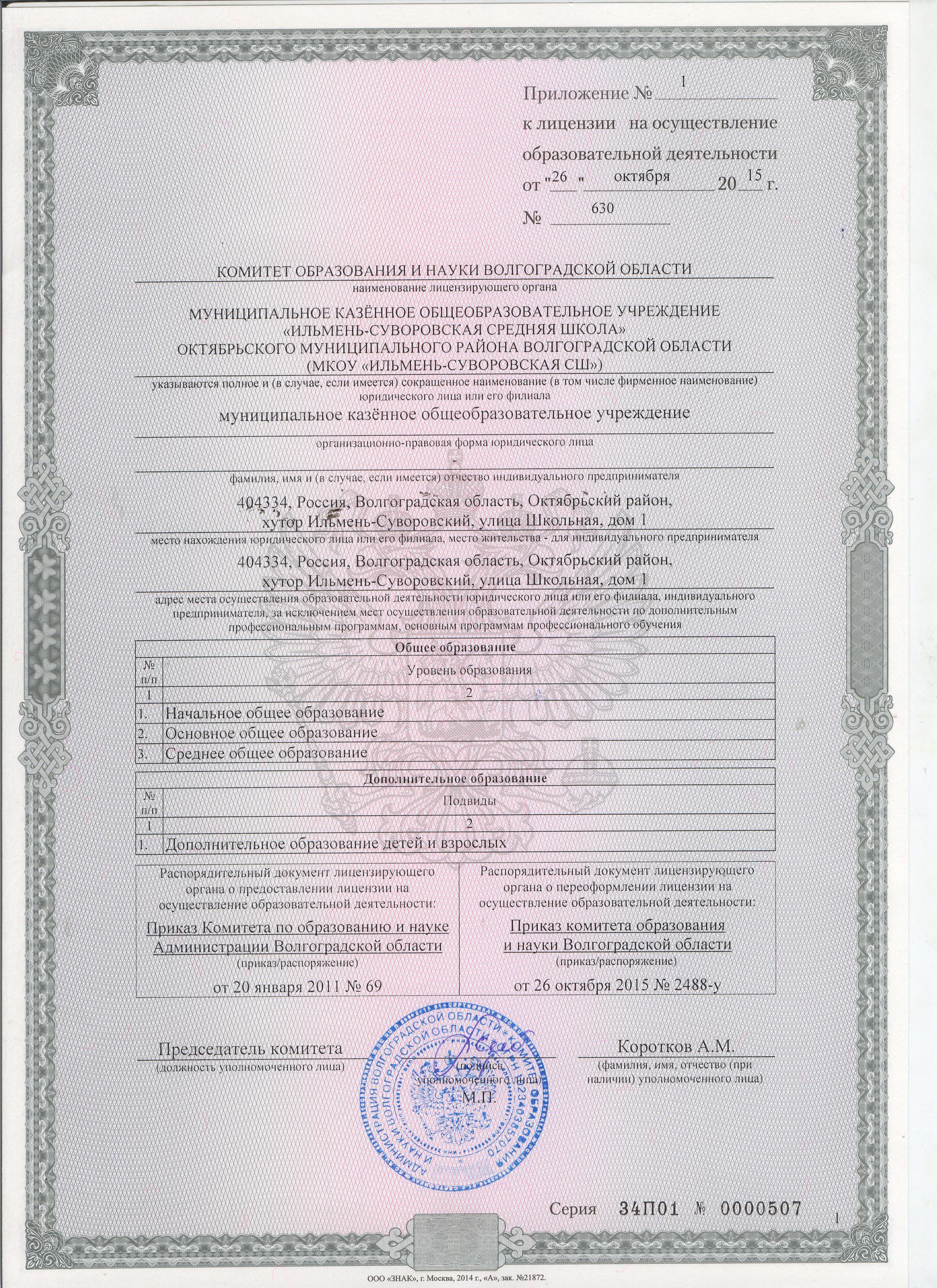 серия 34 А01 №0000423 Регистрационный № 432 от 02 сентября 2015 года, выдан Комитетом образования и науки Волгоградской области. Срок действия свидетельства до 12 апреля 2025 год